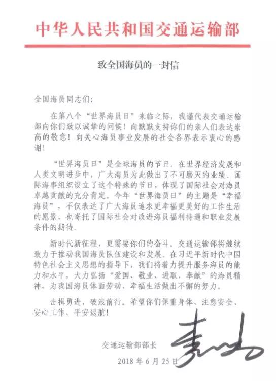 交通運(yùn)輸部部長李小鵬致信慰問全體海員。25日,中國籍民用船舶、中國航運(yùn)企業(yè)擁有或光租的非中國籍船舶將掛滿旗慶祝。在國外部分港口,中國駐地使領(lǐng)館將派員登輪慰問在港停泊的中國海員。此外,交通運(yùn)輸部海事局與中國海員建設(shè)工會(huì)共同組織開展了大規(guī)模的“2018年媒體走近海員”新聞采訪活動(dòng),22名媒體記者分乘6艘船舶,和海員同吃同住同工作,身臨其境,現(xiàn)場報(bào)道,向社會(huì)展現(xiàn)當(dāng)代中國海員的風(fēng)采。