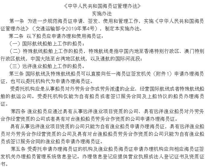 《<中華人民共和國海員證管理辦法>實(shí)施辦法》 2019年12月20日起施行!